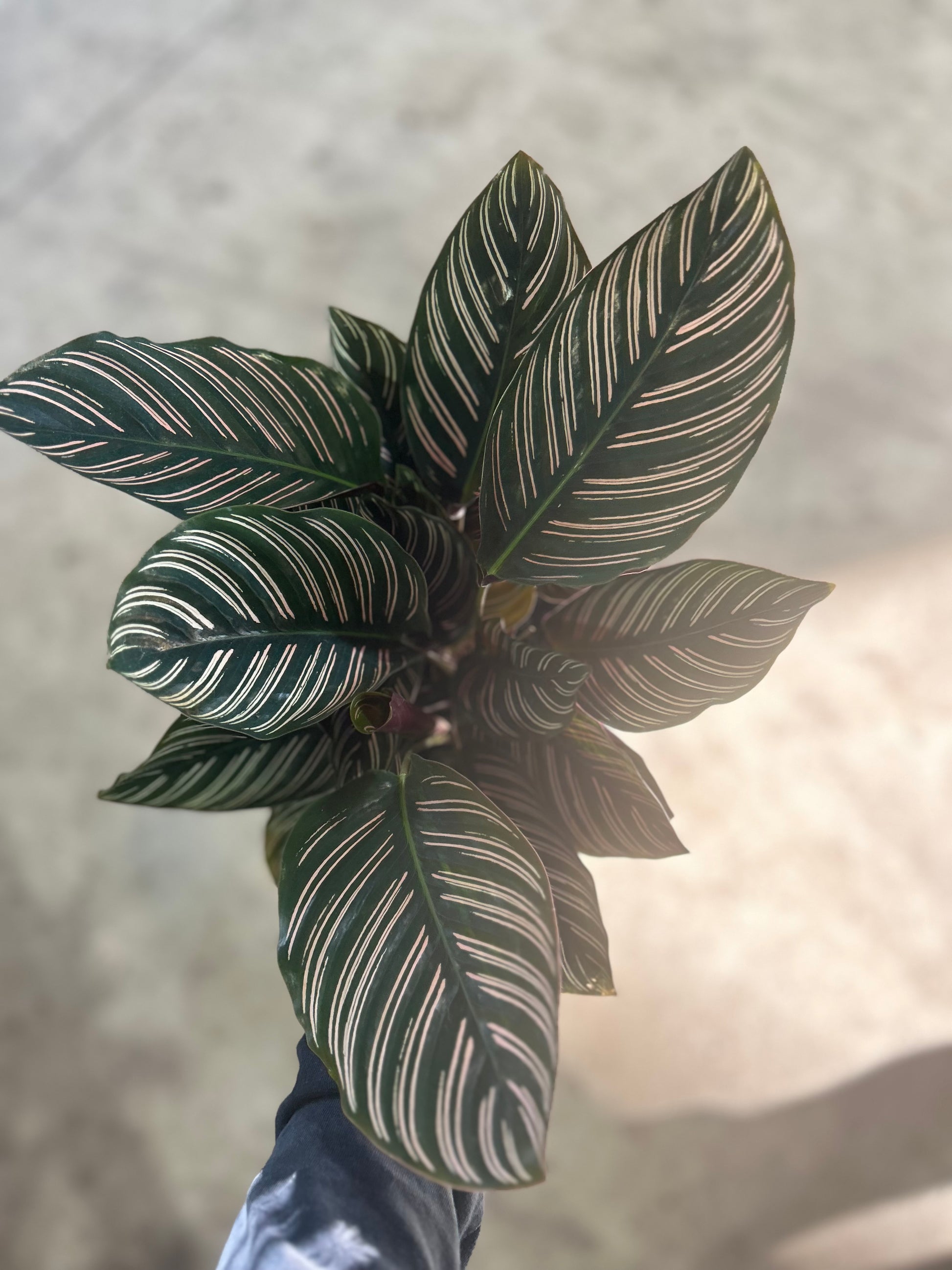 Calathea Ornata, also known as the Pinstripe Calathea, is a strikingly beautiful houseplant that belongs to the Marantaceae family. It is loved for its bold green leaves with distinct pink or white pinstripe patterns running along the veins, making it an eye-catching addition to any indoor space. The plant has a graceful, tropical vibe and is perfect for adding a splash of color and texture to your home.
