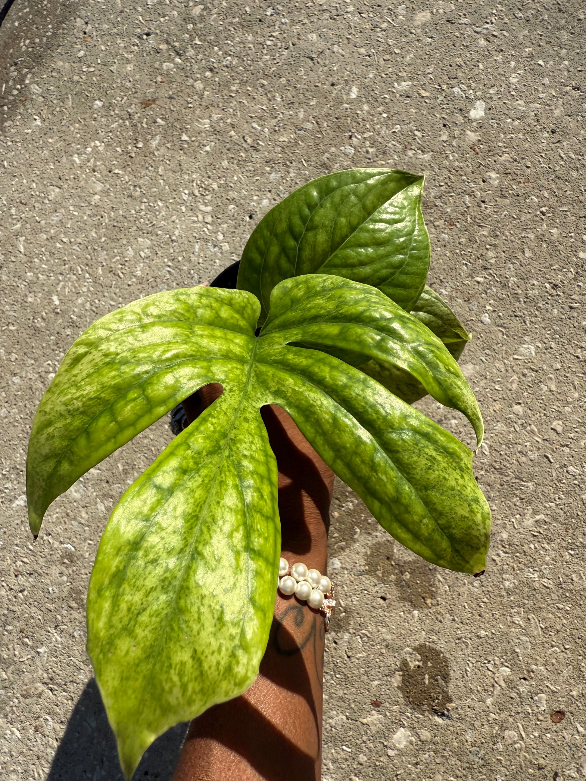 Fresh and eye-catching, Amydrium 'Medium' Mint features beautifully textured leaves with subtle minty variegation that give it a cool, refreshing vibe. This rare aroid offers a climbing or trailing growth habit and thrives in bright, indirect light—perfect for adding a soft yet striking accent to your collection.
