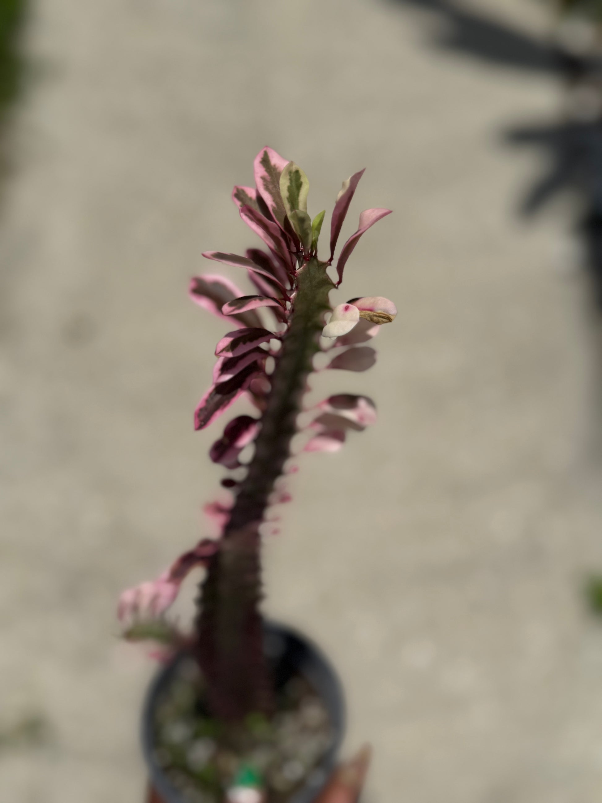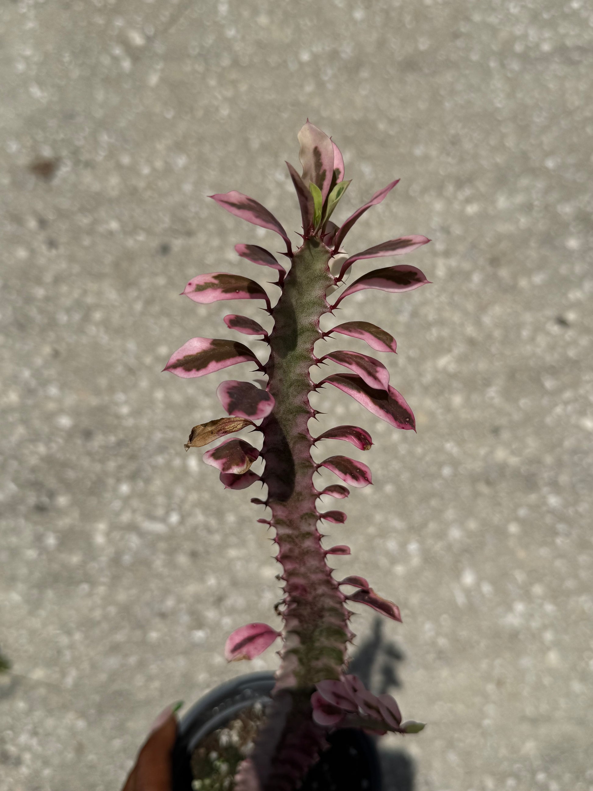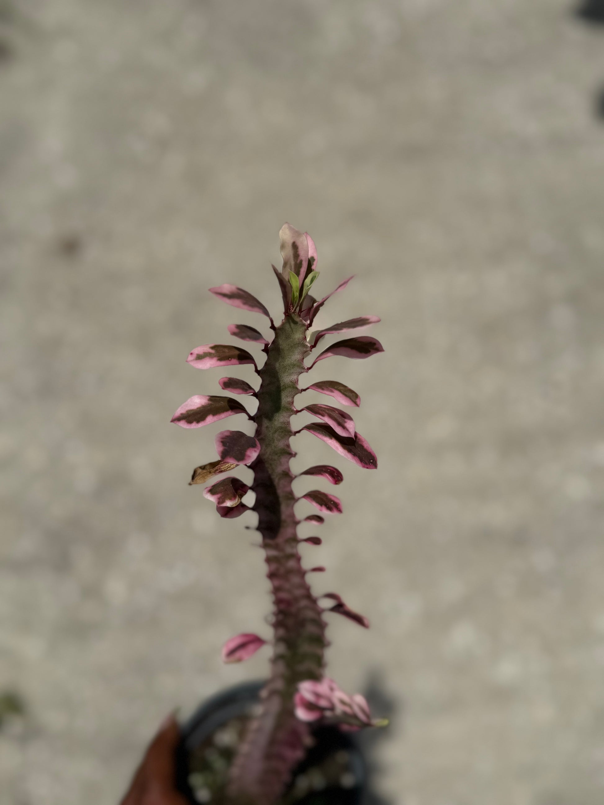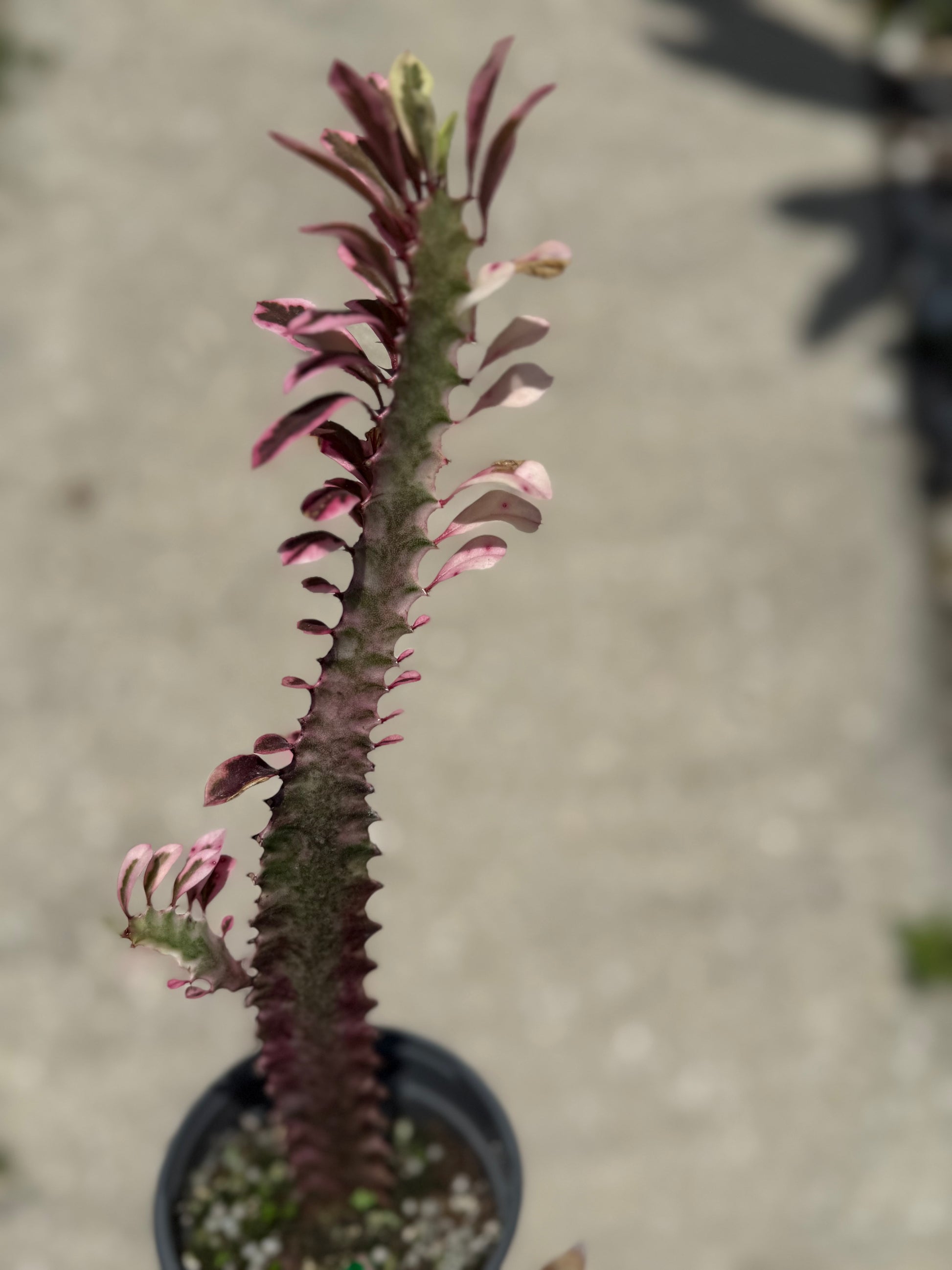 Place in bright, direct light for best color and growth. Water sparingly, allowing the soil to dry completely between waterings—overwatering can cause root rot. Use a well-draining cactus or succulent mix. Protect from frost, as it prefers temperatures above 50°F. Euphorbia’s sap can be irritating—wear gloves when handling and keep away from pets and children.