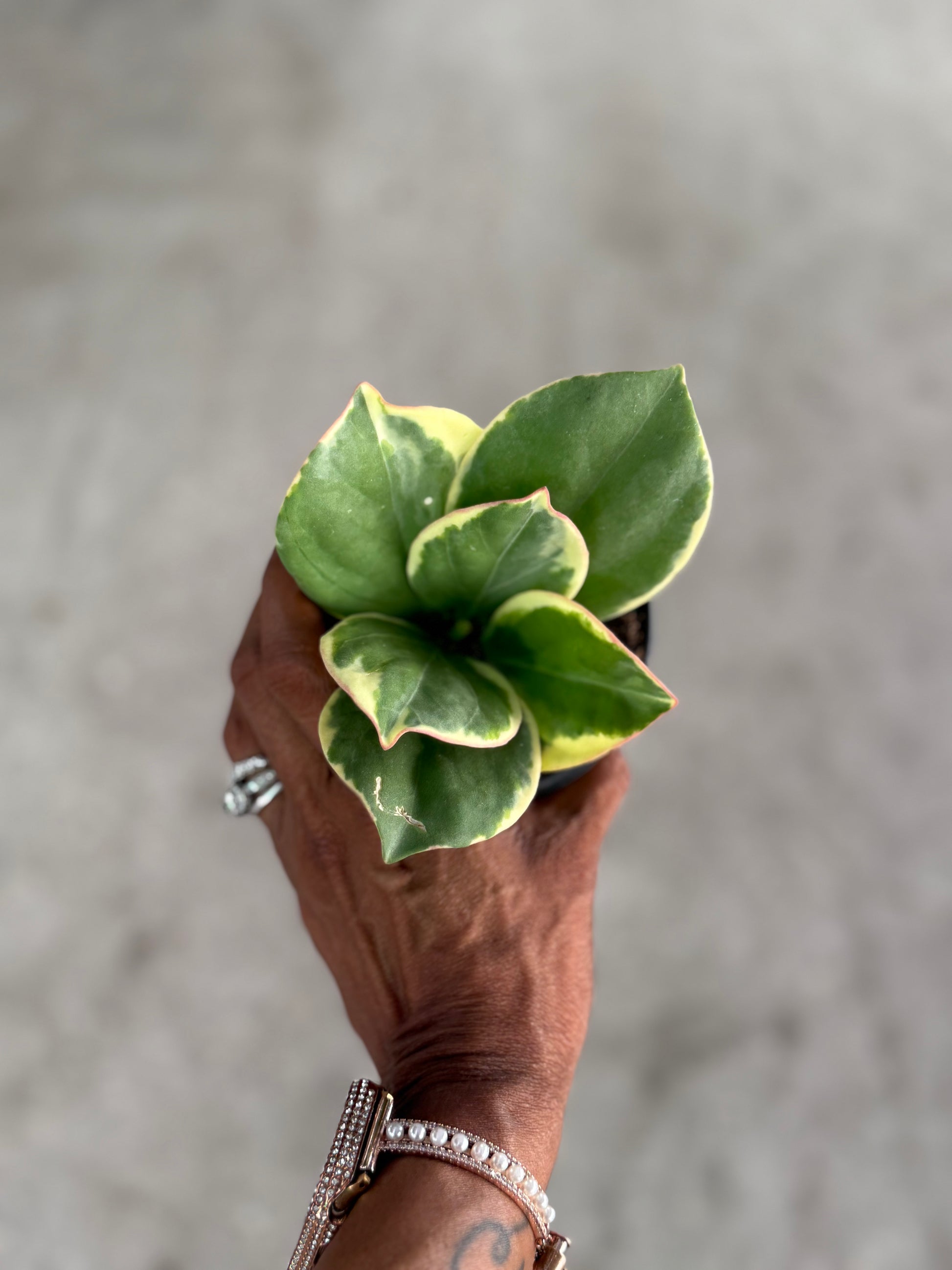 A true collector’s gem, Hoya 'Pachyclada' Outer Variegated stuns with its thick, succulent-like leaves edged in creamy white variegation. Its dense, compact growth habit makes it a fantastic choice for small spaces, while its signature clusters of fragrant, waxy flowers add an extra layer of beauty. This slow-growing Hoya thrives with minimal care, making it perfect for both beginners and seasoned plant lovers.