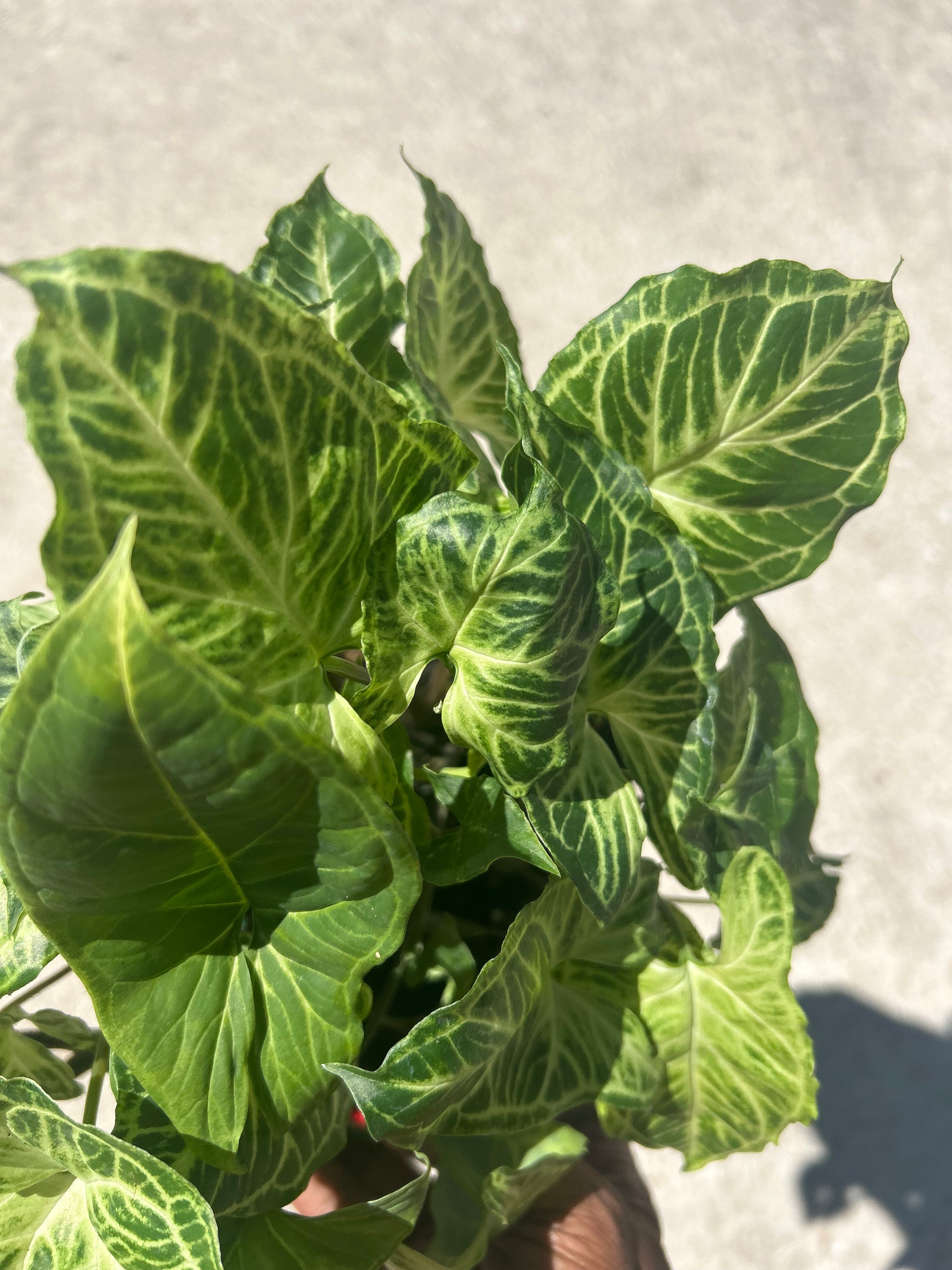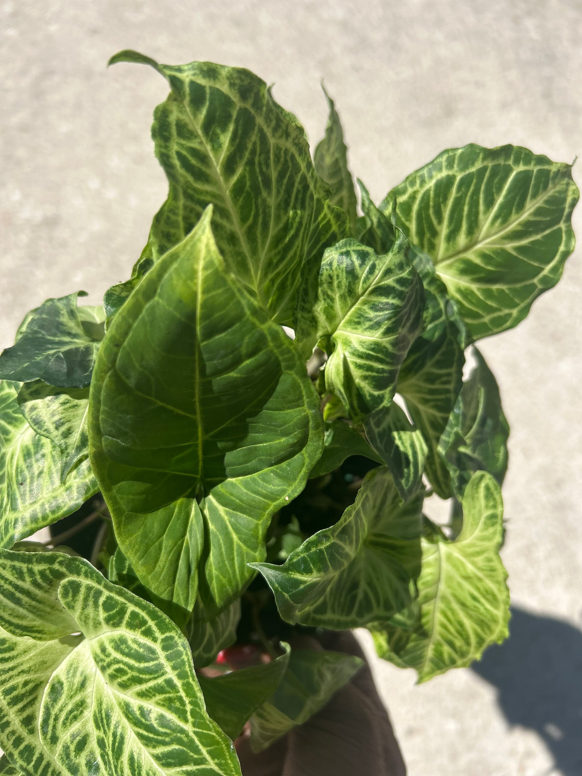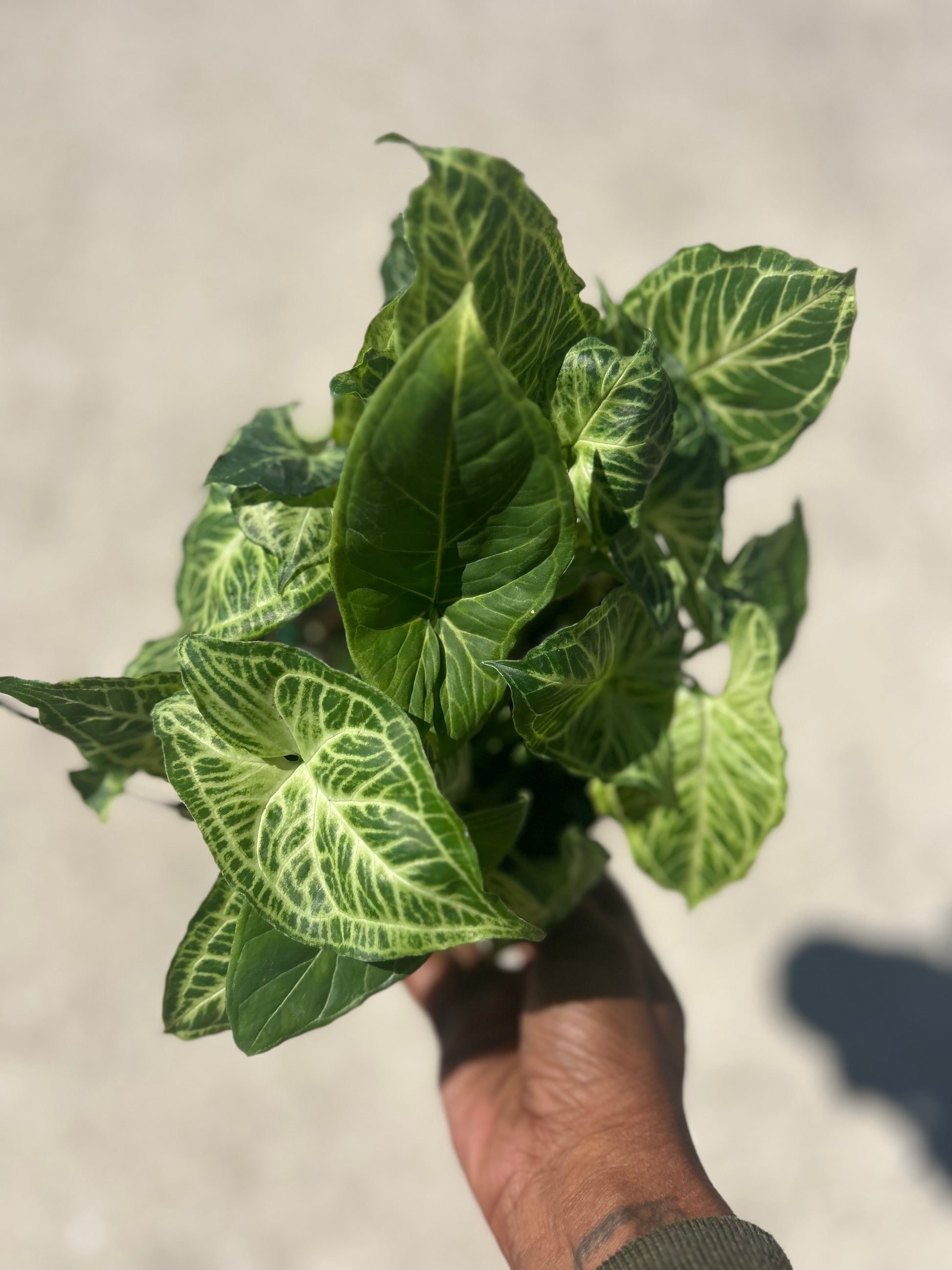 The Syngonium Batik is a beautiful, striking variety of Syngonium, known for its unique, variegated leaves that boast a mix of white, cream, and green. With its dramatic color pattern resembling the intricate designs of batik fabric, this plant will definitely stand out in any collection. It’s the perfect choice for those who appreciate a bit of artistry in their plants while still enjoying the easy-care nature of the Syngonium family.