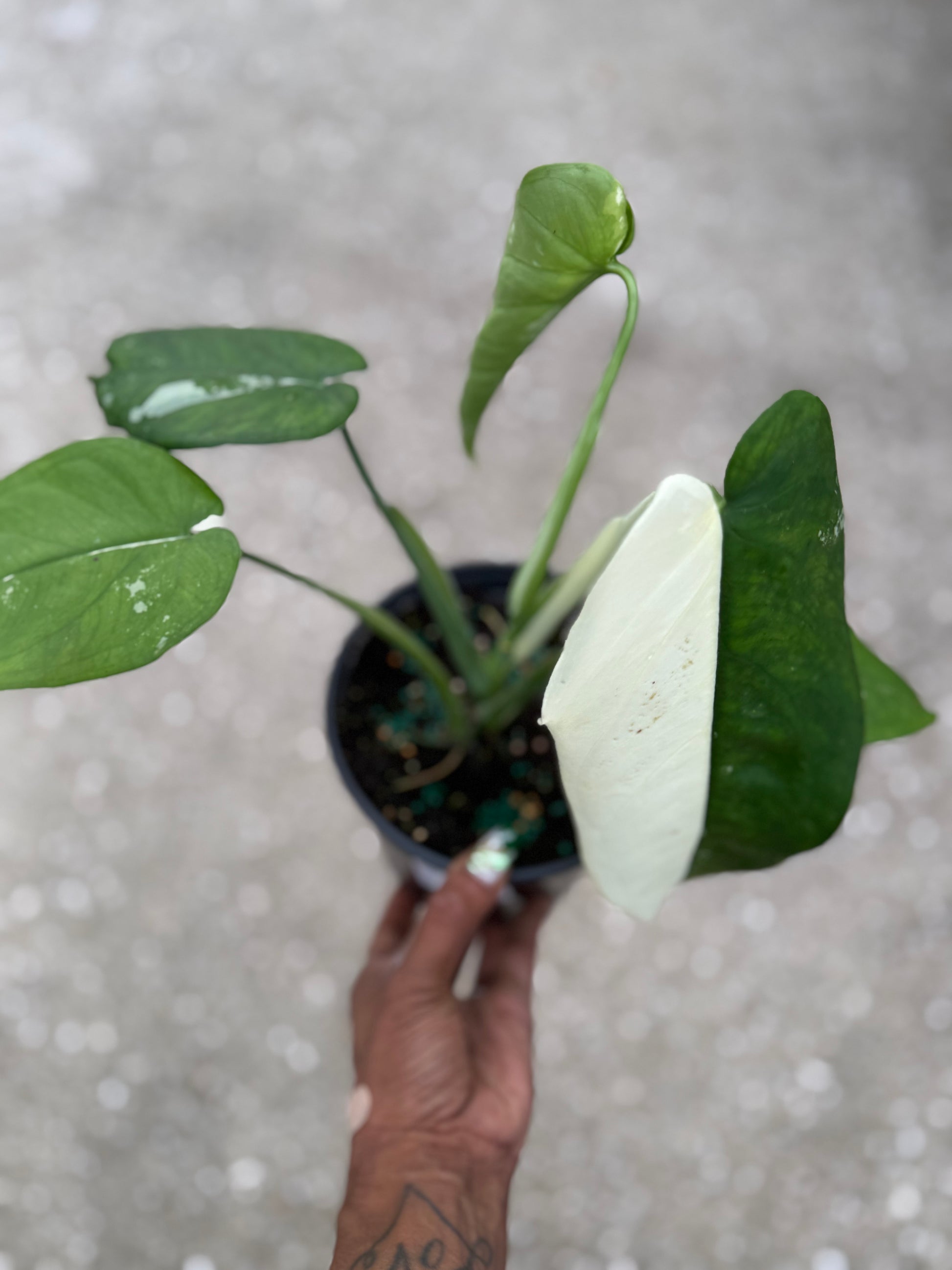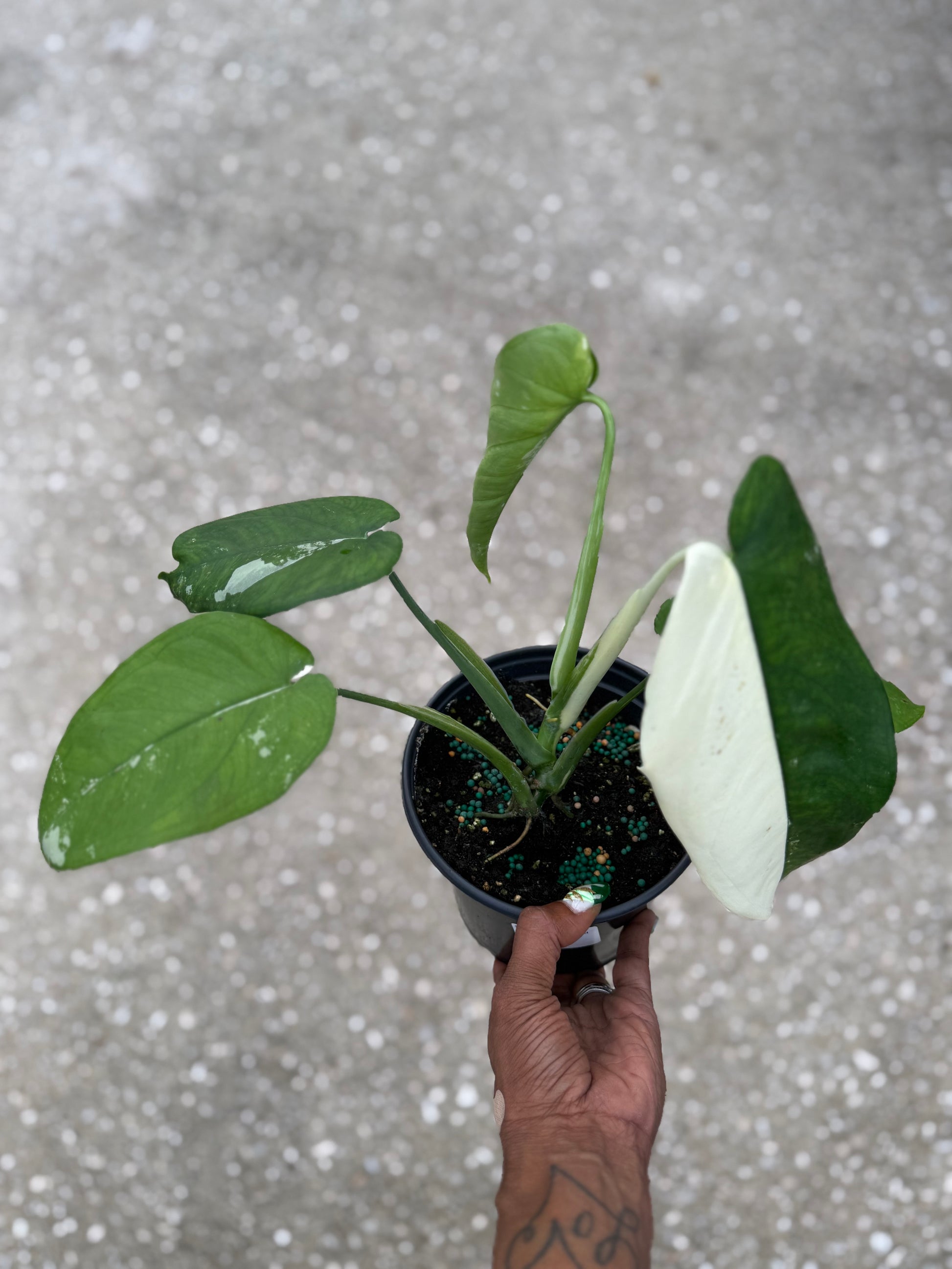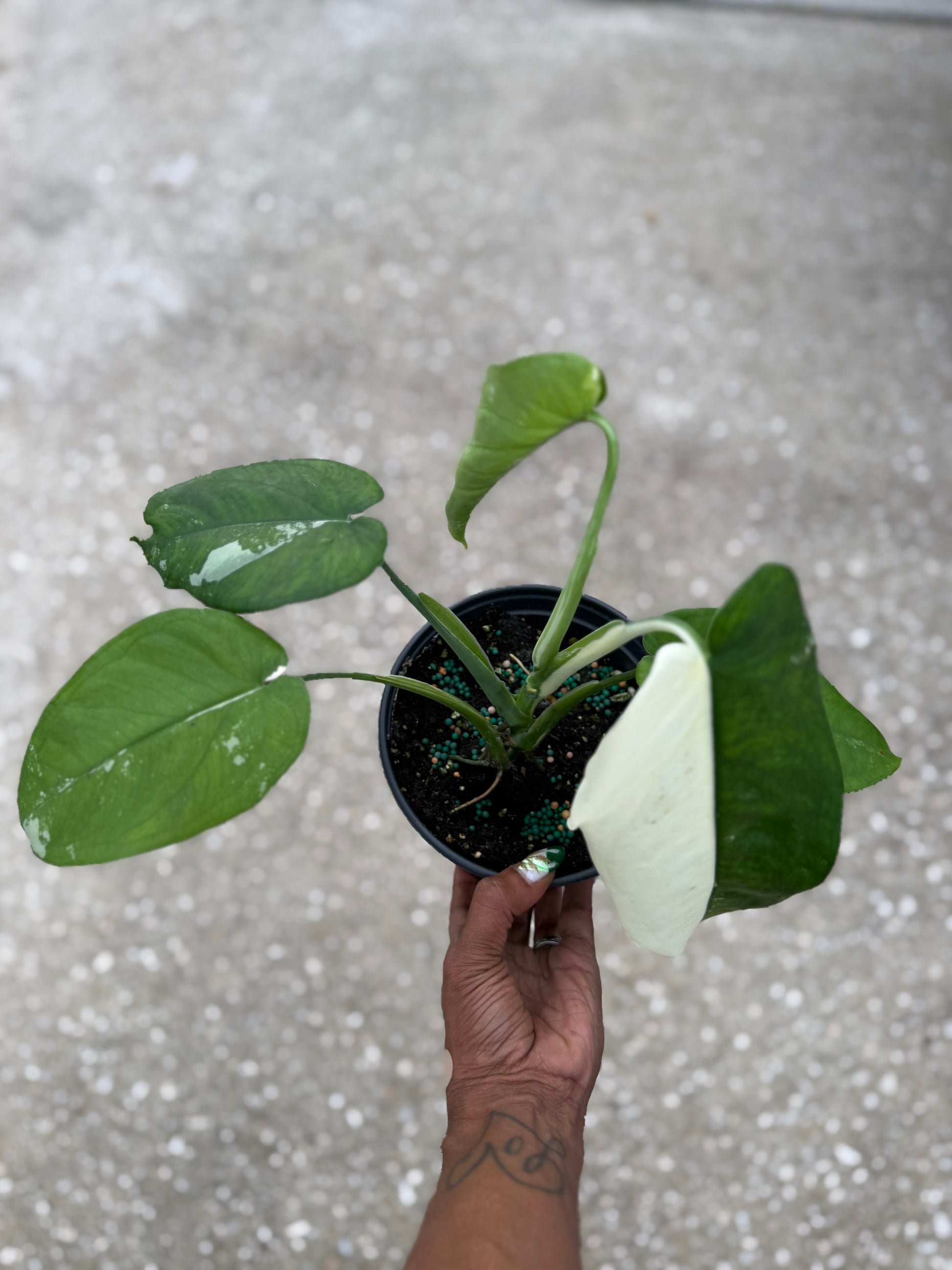 A rare gem for collectors, Syngonium 'Chiapense' Variegated shows off bold, creamy-white variegation splashed across broad, lush green leaves. Each leaf has its own unique marbling pattern, making every plant a one-of-a-kind display piece. With its strong, climbing nature, it can be trained up a moss pole for larger, dramatic foliage.